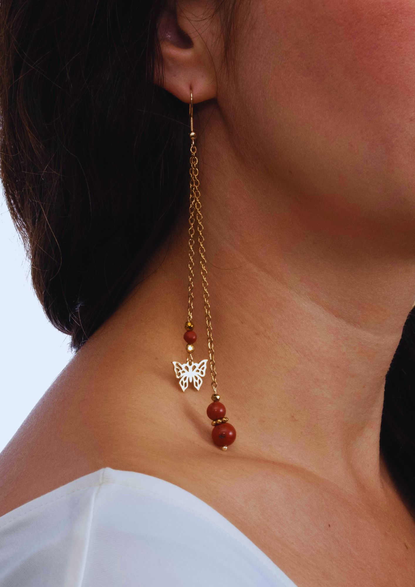 Boucles d’oreilles en jaspe rouge associée au symbole du papillon en acier inoxydable pour sublimer votre allure avec une touche de légèreté et de charme.