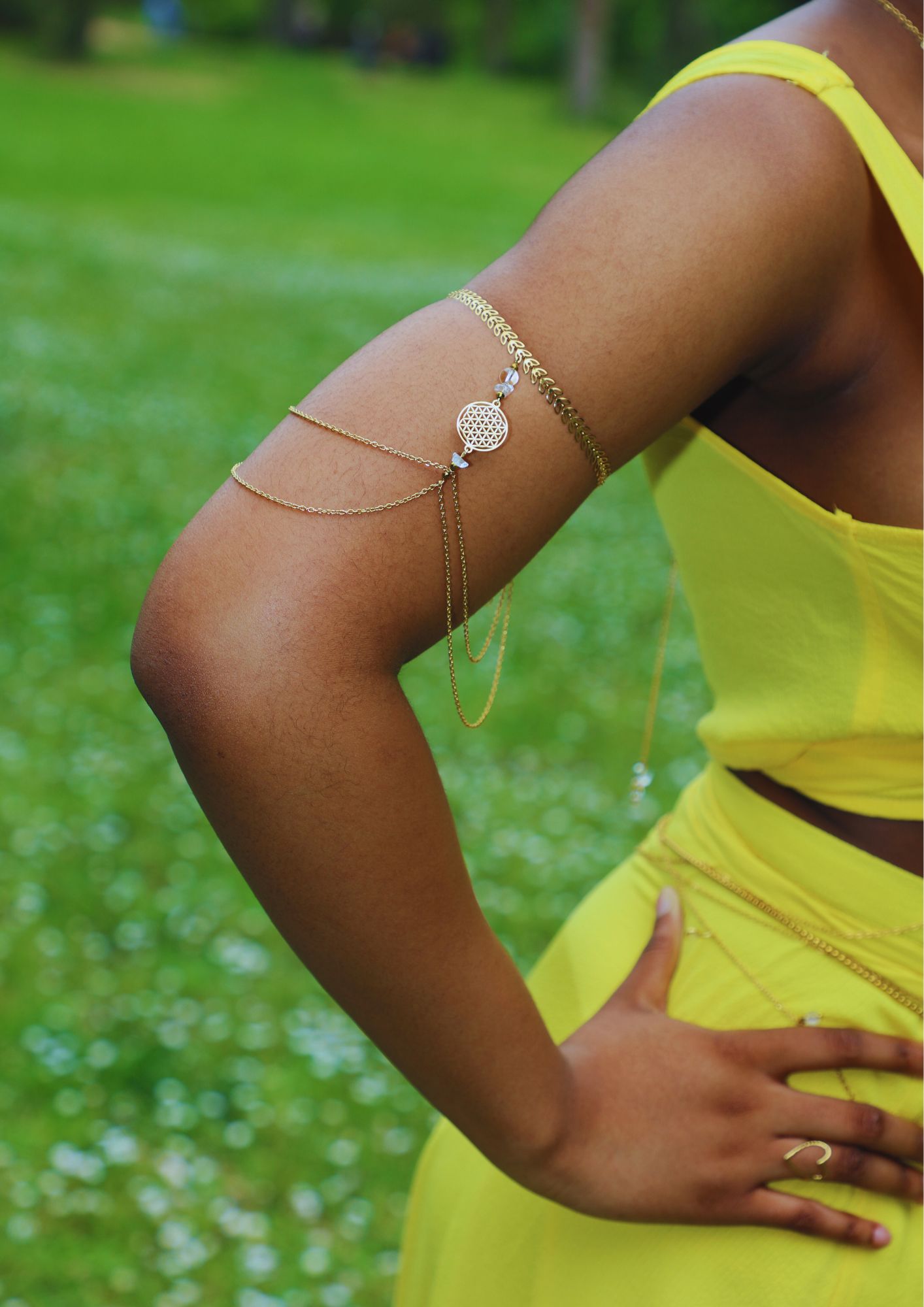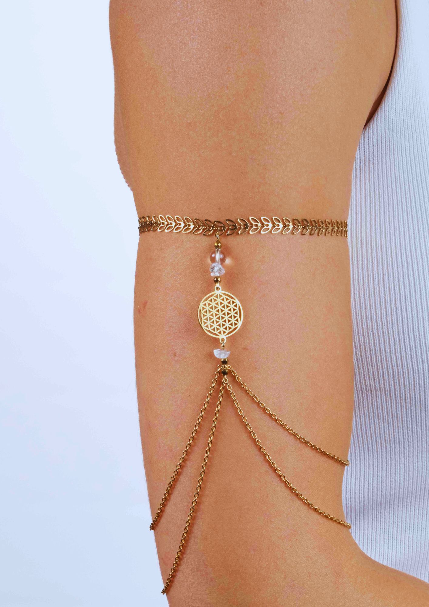 Découvrez un bijou de bras unique, conçu pour ajouter une touche d’élégance intemporelle à votre look. Ce bijou en acier inoxydable est orné du symbole de la fleur de vie, associé à des perles naturelles, pour une combinaison parfaite de raffinement et de signification profonde. Idéal pour celles qui souhaitent allier style sophistiqué et harmonie spirituelle dans leur tenue.