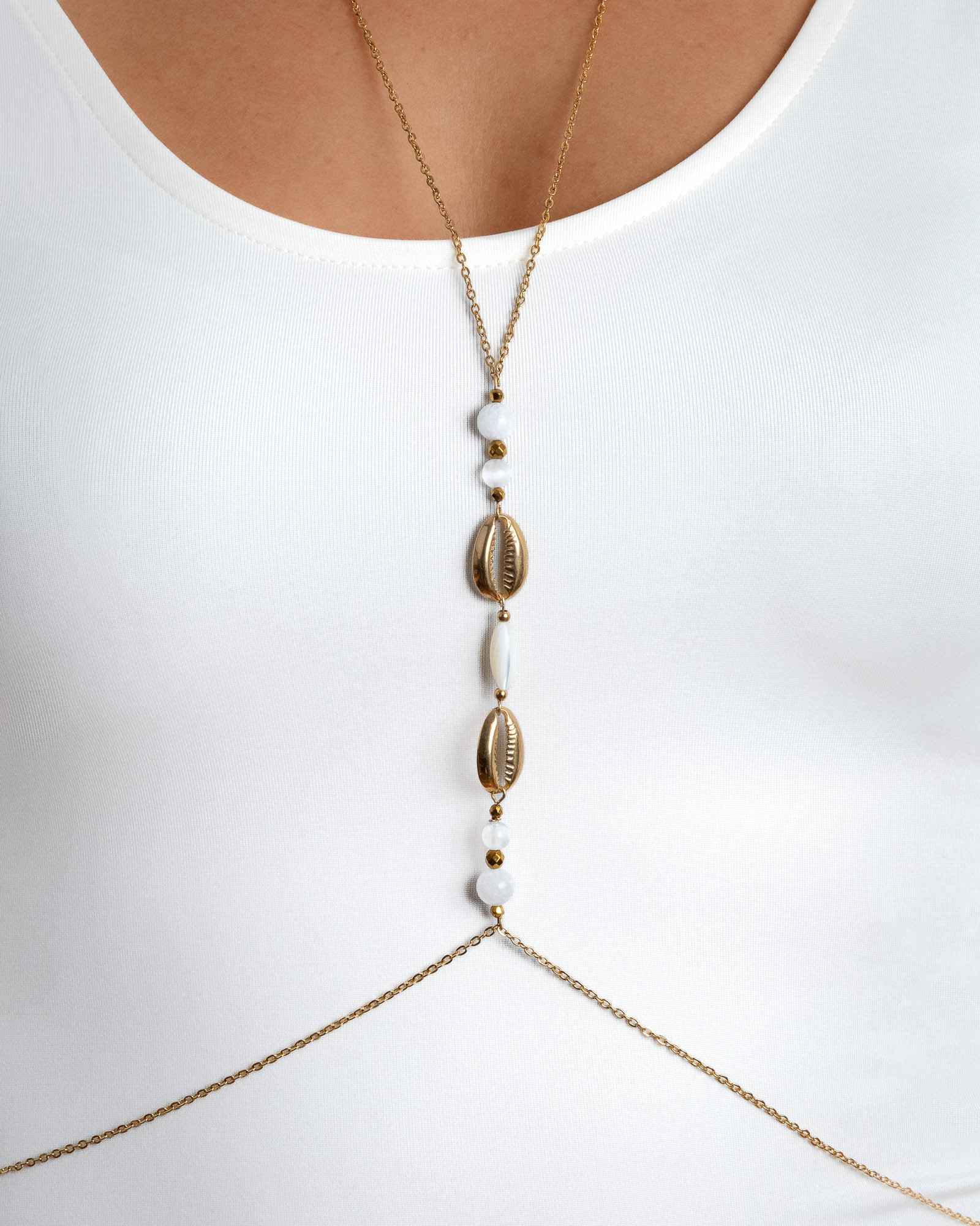Ce bijou de buste est conçu pour mettre en valeur votre silhouette avec délicatesse. Les éléments de cauris et de nacre sont disposés avec soin pour créer une harmonie visuelle unique, parfaite pour les tenues bohèmes, estivales ou élégantes.