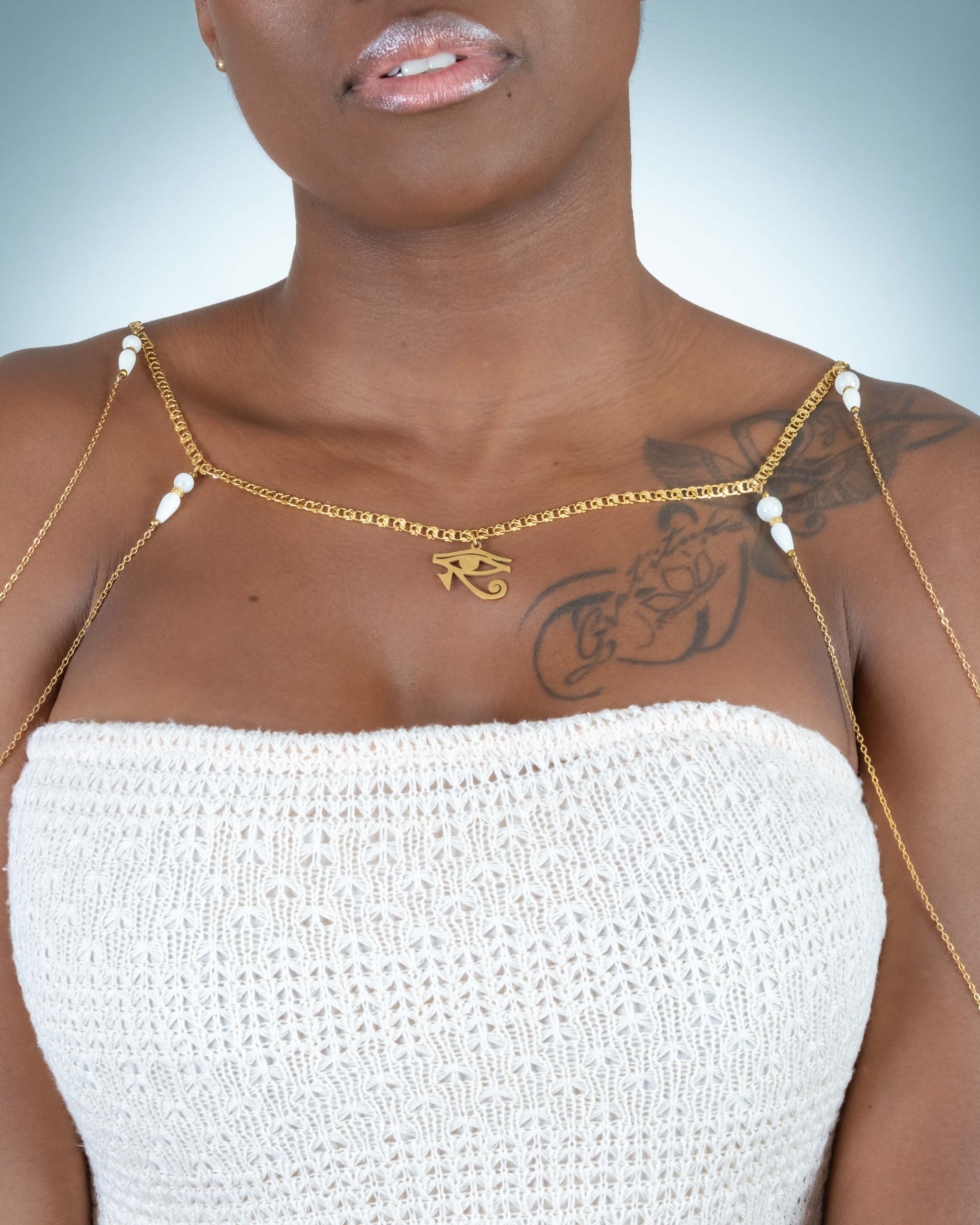 Découvrez un bijou d’exception avec cette somptueuse chaîne d’épaules. Composée d’une chaîne principale à maillons plats pour une allure épurée, elle est sublimée par deux chaînes délicates ornées de pierres de Lune qui tombent avec grâce sur vos épaules, accompagnées d’un pendentif représentant l’Œil d’Horus, symbole puissant de protection et de clairvoyance.