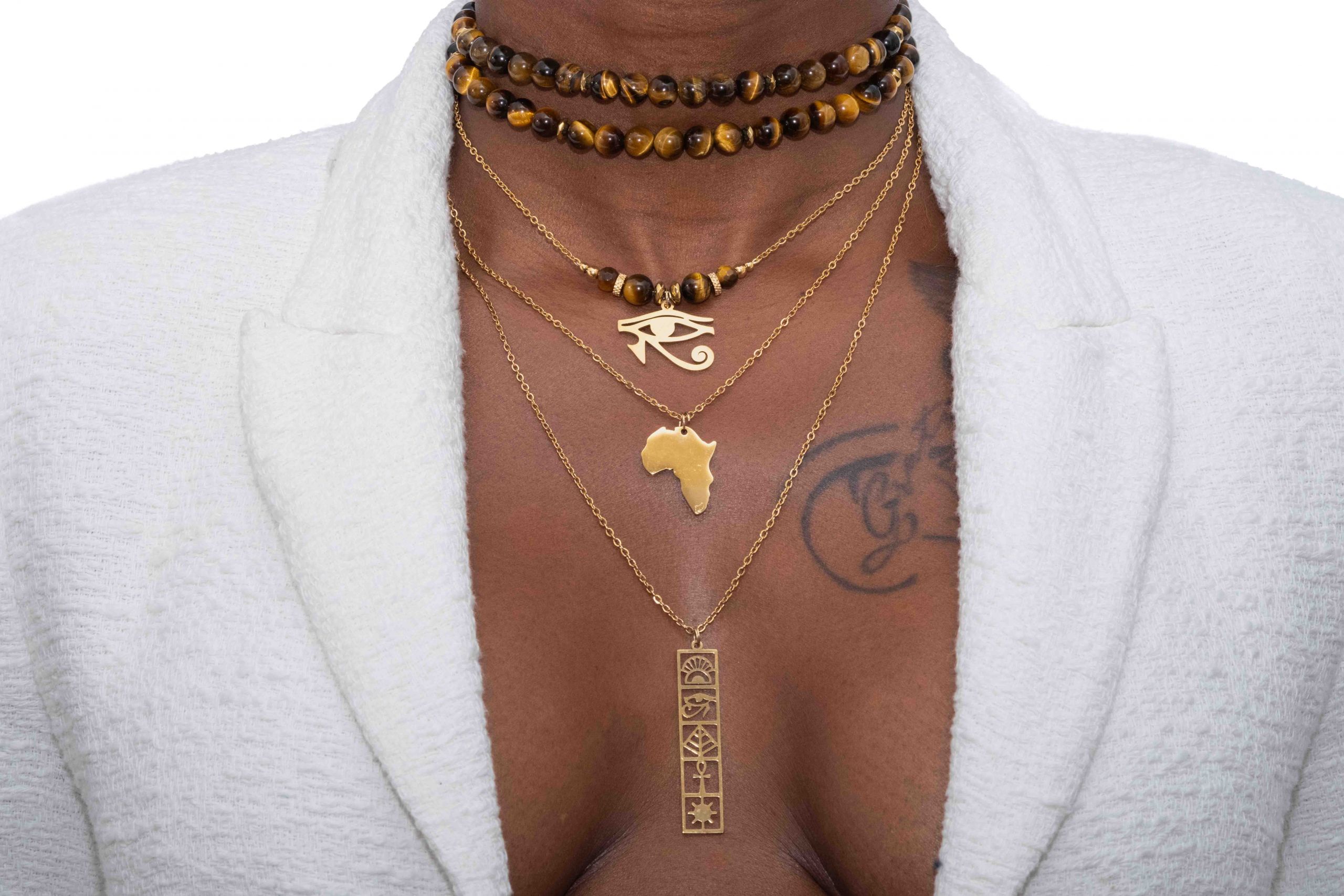 Ce bijou est composé de deux premières rangées en pierres naturelles, symboles de pureté et d’énergie, associées à des pendentifs puissants : l’Œil d’Horus, la carte de l’Afrique et des hiéroglyphes. Ce mélange d’éléments est un hommage aux racines africaines, à la protection spirituelle, et à la sagesse ancestrale.