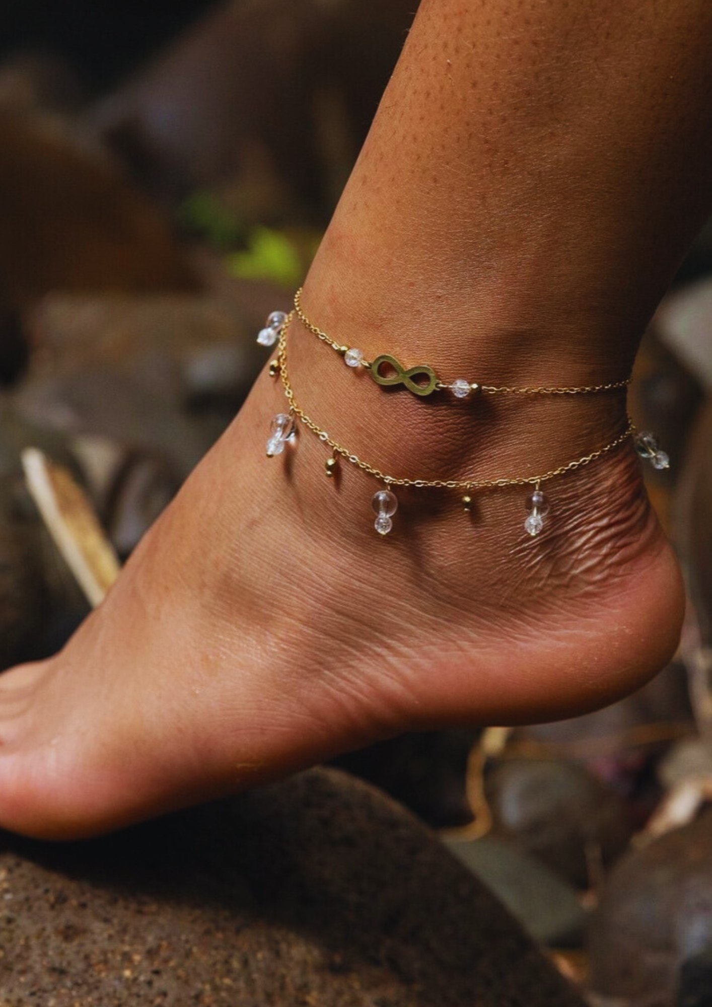 Laissez cette chaîne de cheville, ornée du signe de l’infini et de perles pendantes, révéler votre charme et votre élégance intemporelle. Portez-la pour exprimer votre raffinement et votre style unique.