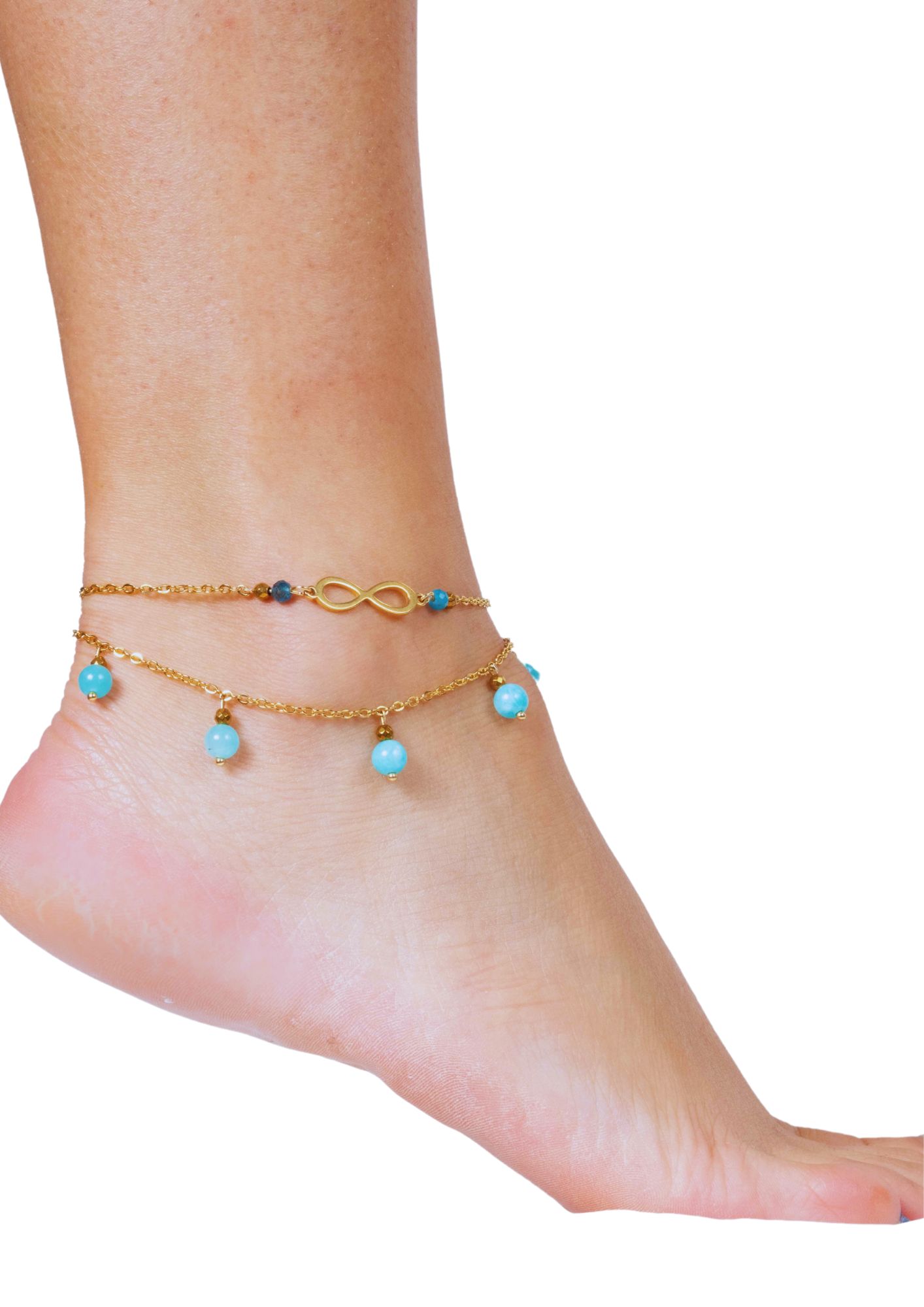 Découvrez une chaîne de cheville exquise, pensée pour magnifier votre allure avec une touche d’intemporalité et de grâce. Ce bijou en acier inoxydable est orné du symbole de l’infini, représentant éternité et continuité, et est agrémenté de perles pendantes en amazonite qui ajoutent une dimension de mouvement délicat et de sophistication à votre style.
